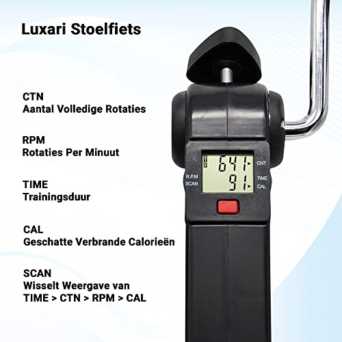 Met de Luxari Stoelfiets kunt u op een gemakkelijke en effectieve manier aan uw gezondheid werken, waar en wanneer u maar wilt. Door het compacte ontwerp kan de stoelfiets eenvoudig worden gebruikt terwijl u tv kijkt, werkt of ontspant. Bovendien biedt de stoelfiets een lage impact training, wat betekent dat het ideaal is voor mensen met een beperkte mobiliteit, ouderen of voor mensen die herstellen van blessures. Met de instelbare weerstandsniveaus kunt u uw training aanpassen aan uw niveau en doelen, en dankzij de digitale monitor kunt u uw voortgang bijhouden en uw prestaties verbeteren. Kortom, de Luxari Stoelfiets is een slimme en handige manier om uw gezondheid en welzijn te verbeteren, zonder dat u hiervoor naar de sportschool hoeft te gaan. Luxari Stoelfiets De compacte trainer van Luxari is geschikt voor mensen die thuis graag wat simpele maar effectieve been-en armoefeningen willen doen. De trainer hersteld spierkracht, verbeterd de bloedcirculatie en stimuleert de coordinatie van uw onderbenen en armen. Een zeer handige tool voor mensen met een druk levensstijl en voor ouderen met beperkte mobiliteit. Display Deze luxe trainer is uitgerust met een computer + LCD display die de benodigde informatie meet: de totale trainingstijd, de afgelegde afstand, totale bewegingstijd tijdens training, totale bewegingstijd tijdens alle sessies (de waarde wordt gereset na het vervangen van de batterij), Odometer, RPM en het aantal verbrande calorieën. De teller geeft volledige controle tijdens de training en houdt de voortgang van training naar training bij. Anti-Slip Onder de fiets bevinden zich anti-slipkussentjes die uitstekende grip bieden en houvast bieden. Daarnaast hebben beide pedalen ook een anti-slipstructuur die een comfortabel gebruik garandeert. Perfect voor op kantoor & thuis Dit type hometrainer is gedesigned voor zowel op kantoor als thuis. Vanwege zijn inklapbaarheid erg ruimtebesparend en door het lichtgewicht materiaal makkelijk te verplaatsen.